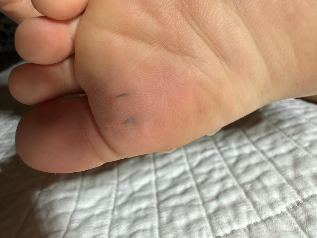 I had just sat down too and taken two bites out of my pizza. I thought of course, this is parent life. I walk over to the deck nonchalantly (I’ve learned it’s best to not react too much when they’re in distress. Makes it way worse) and look at her foot. I see it and think, shit.