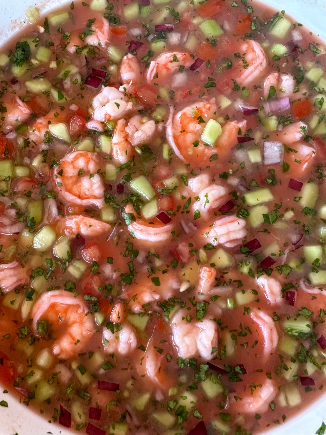 3. Remove the veggies from the fridge and add the shrimp once cooled. Then add the lime juice, Clamato, shrimp juice, salt, and mix well. Add additional salt, pepper, extra cilantro and lime juice if needed or until desired taste.